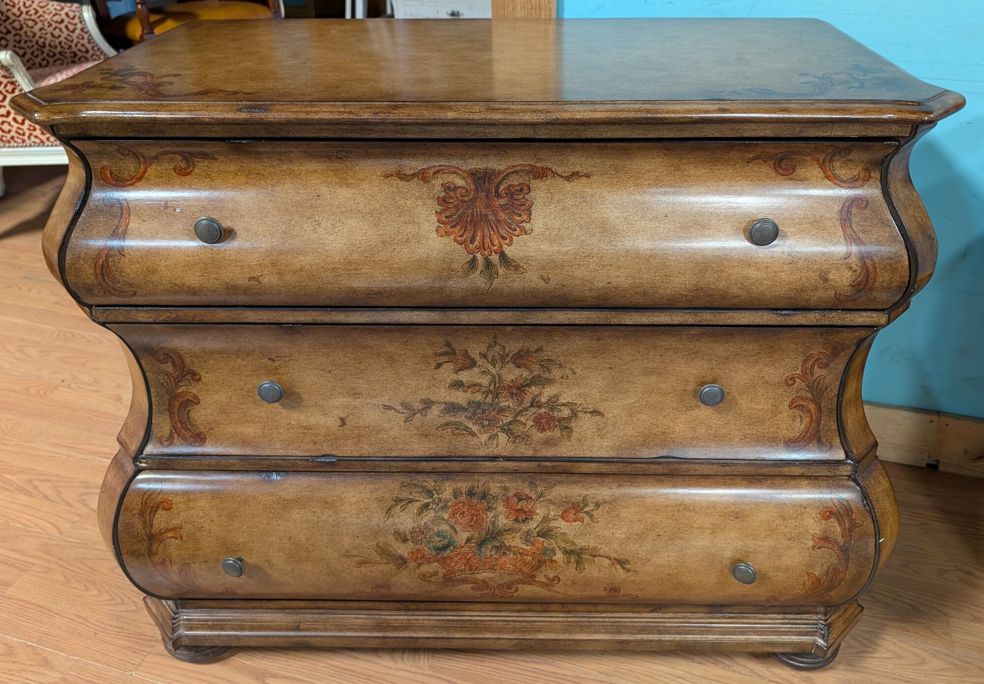 Bombay Style Floral Chest, Light Stain, 3 Drawer 40 x 18.5 x 33h