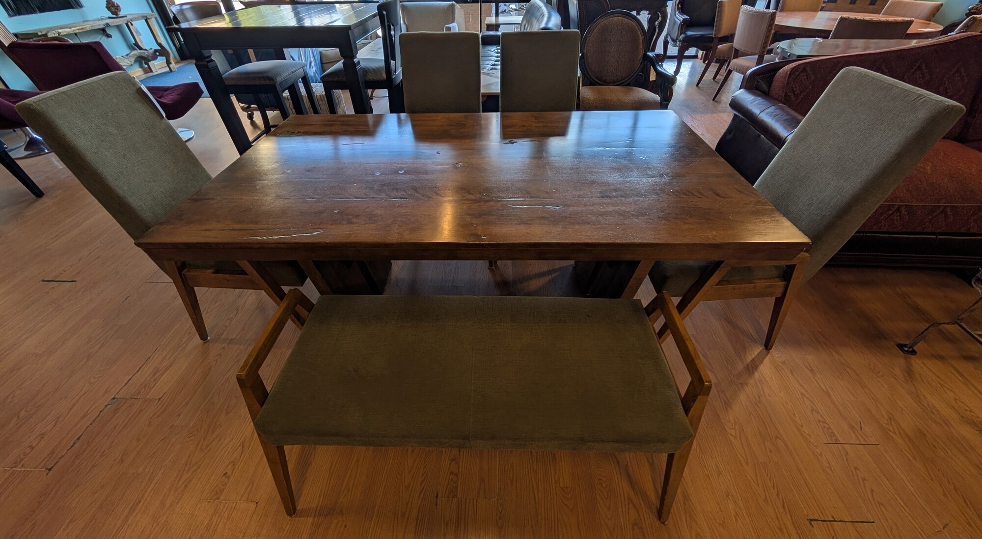 Canadel Market Street, Bench, 4 Chairs Olive Green, Medium Stain 72 x 40 Seat Height 19in