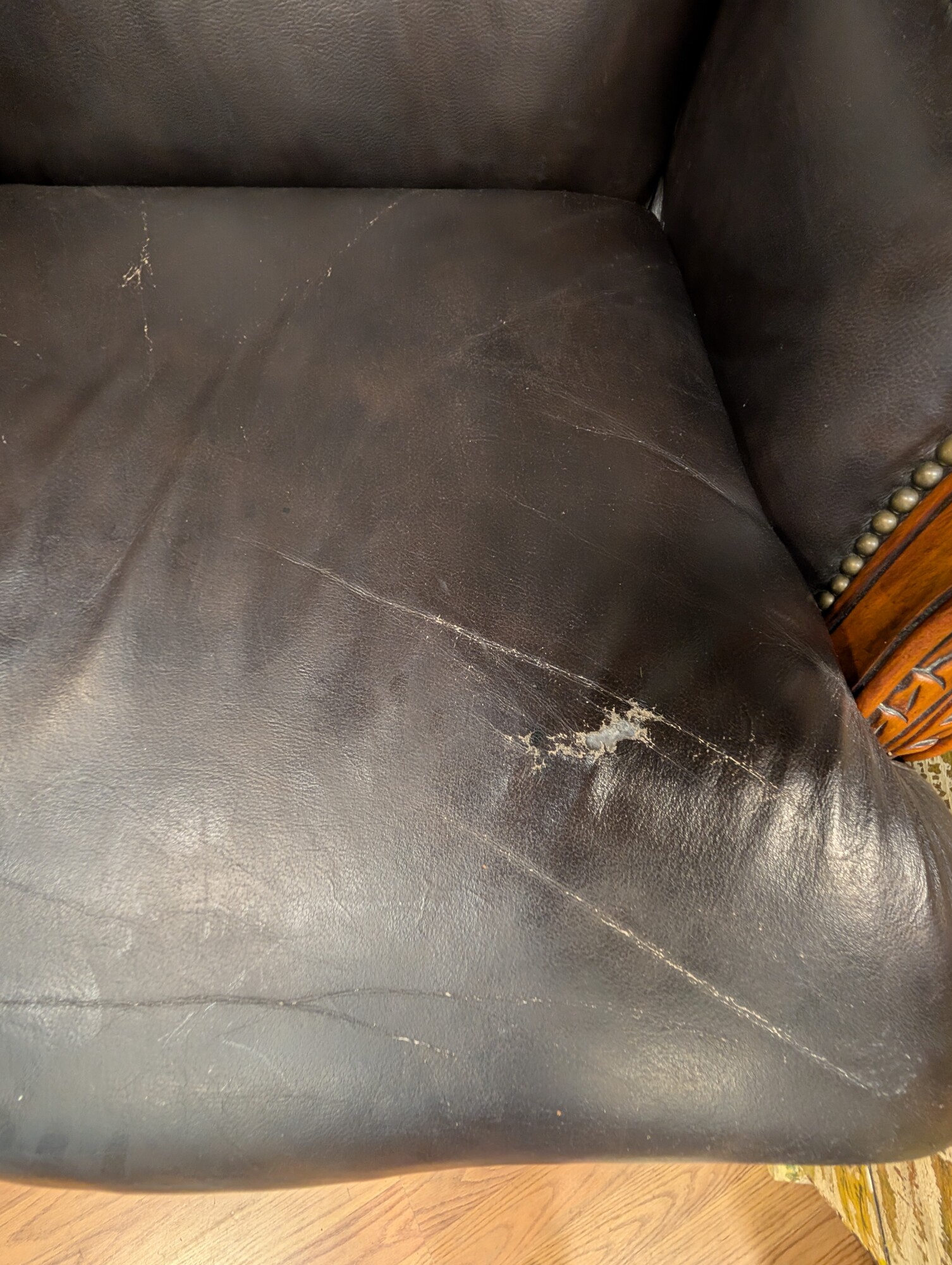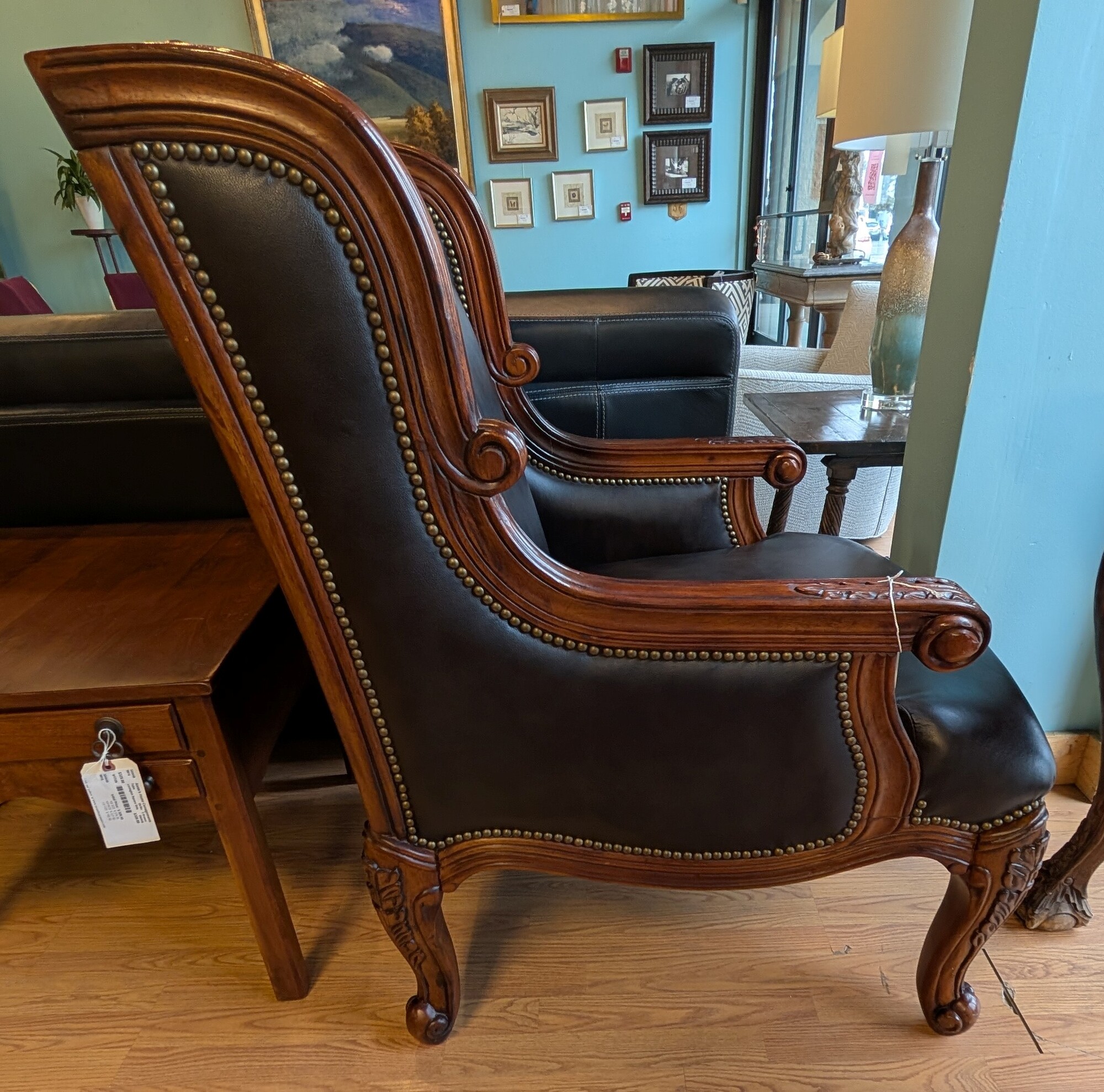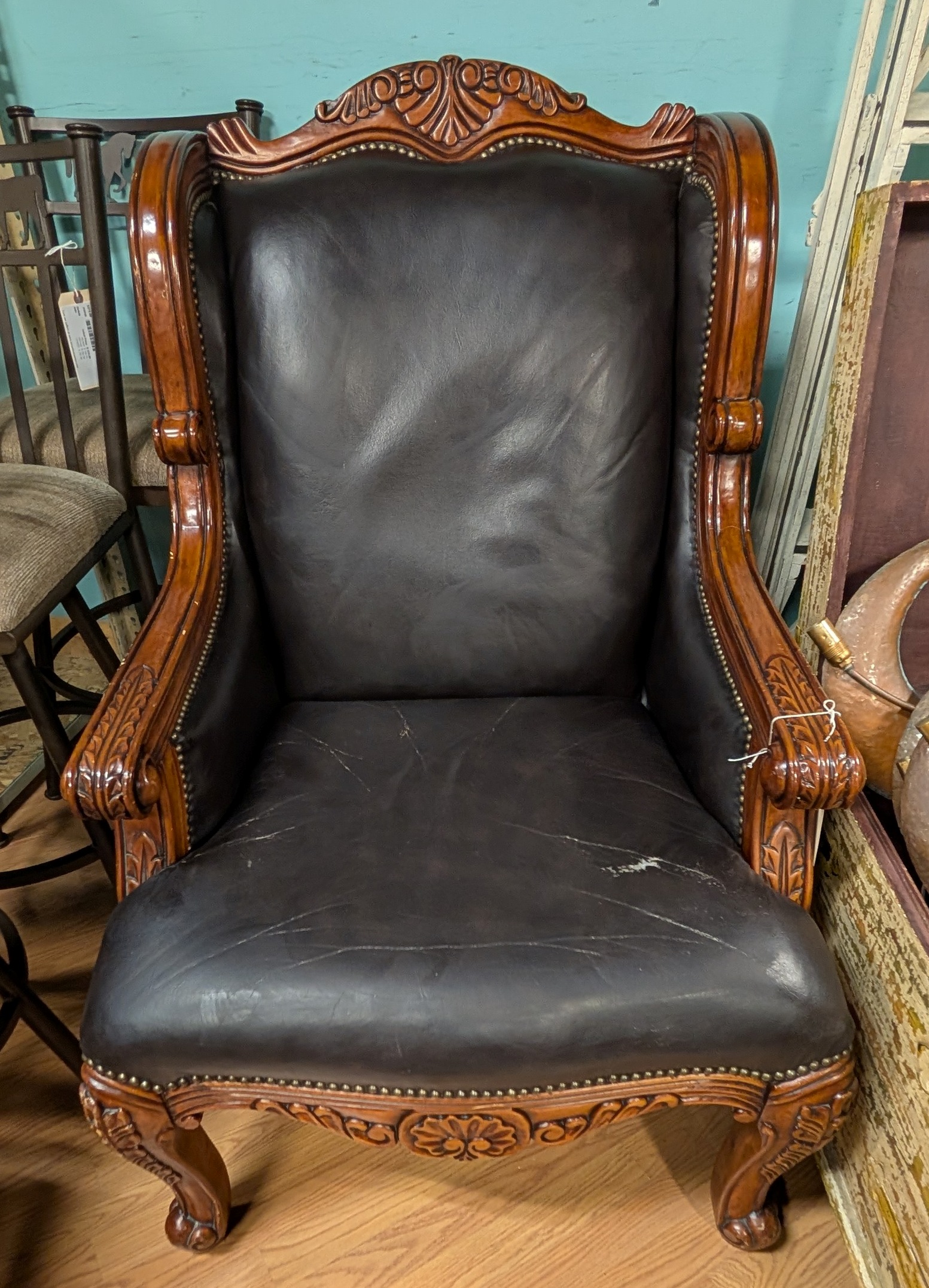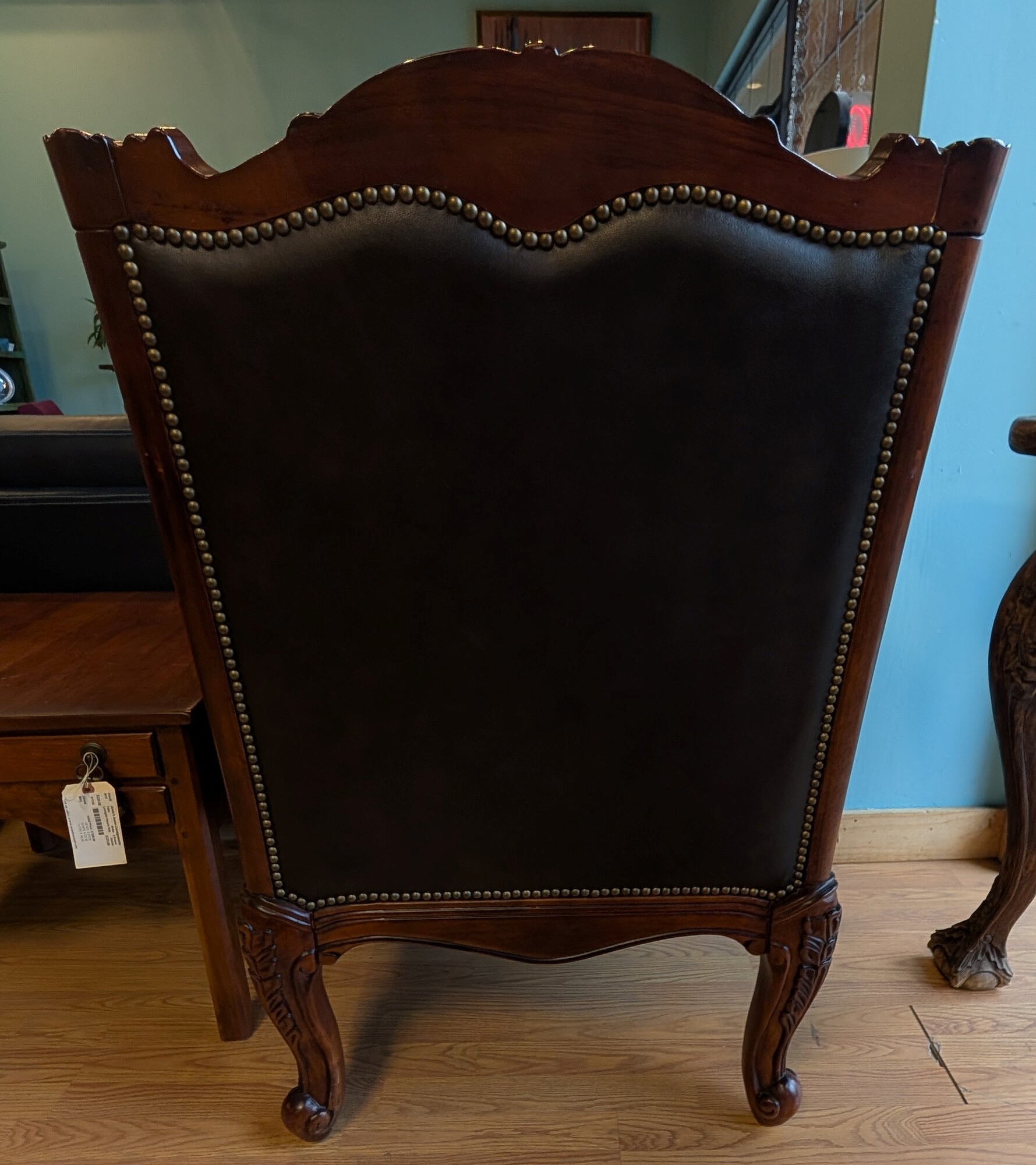 Carved Wood & Leather, Brown, Studs AS IS- Tear in Seat 31 x 32 x 46h