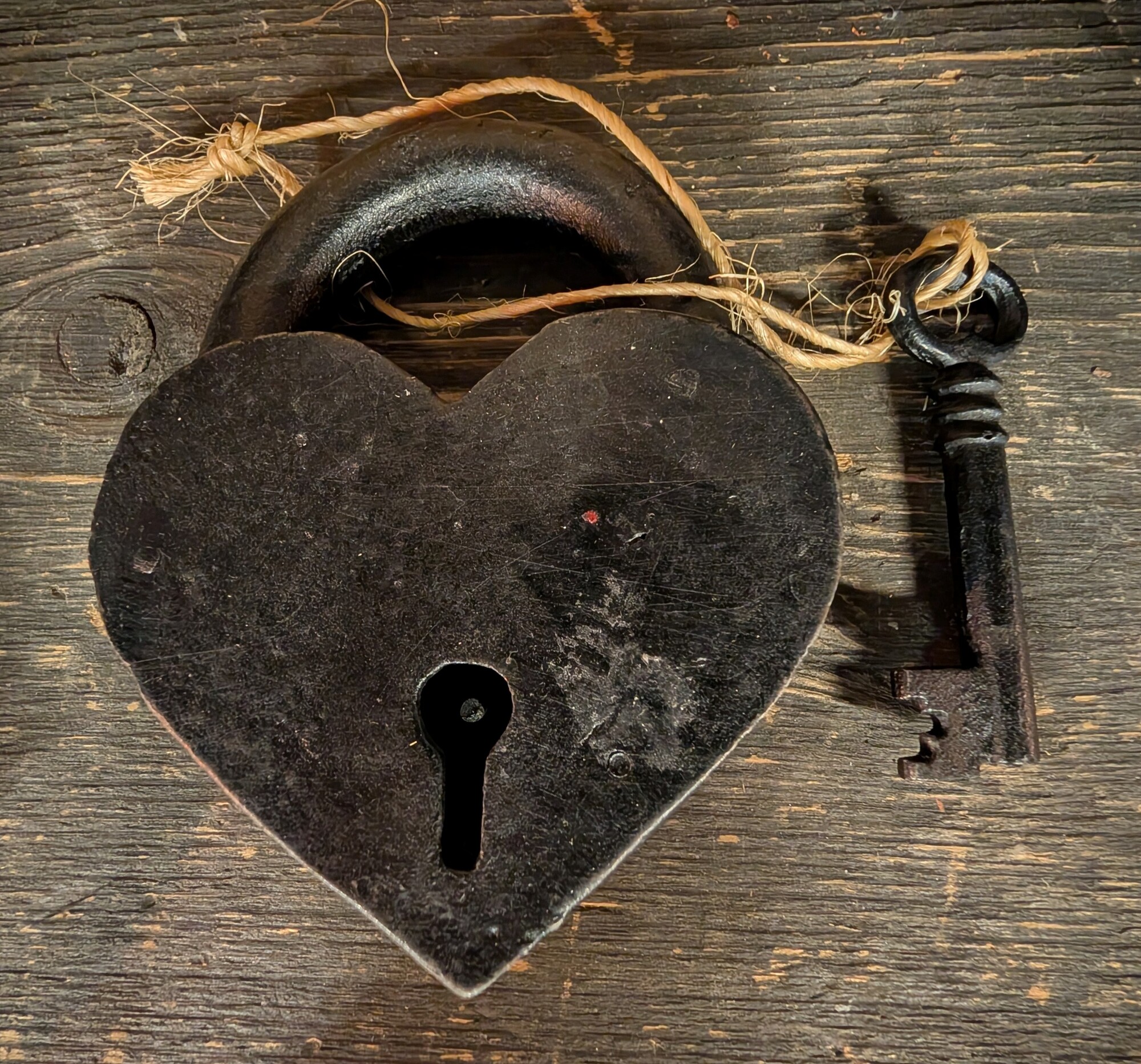Cast Iron Heart Padlock, With Working Key, Black 4.5 x 5.5h