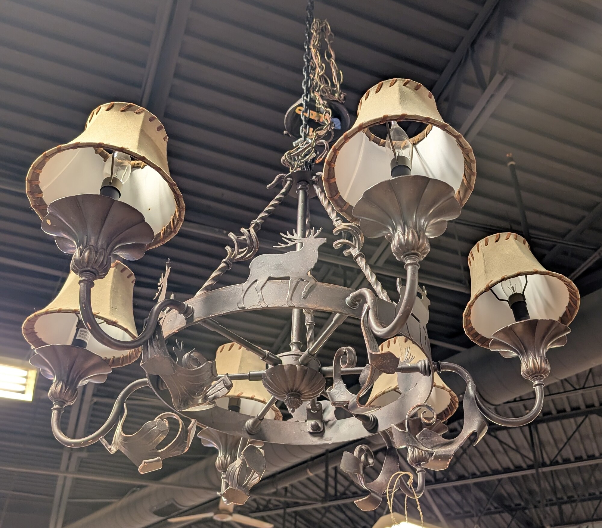 Chandelier 6 Light W/Elk, Suede, Shades 32 x 24h