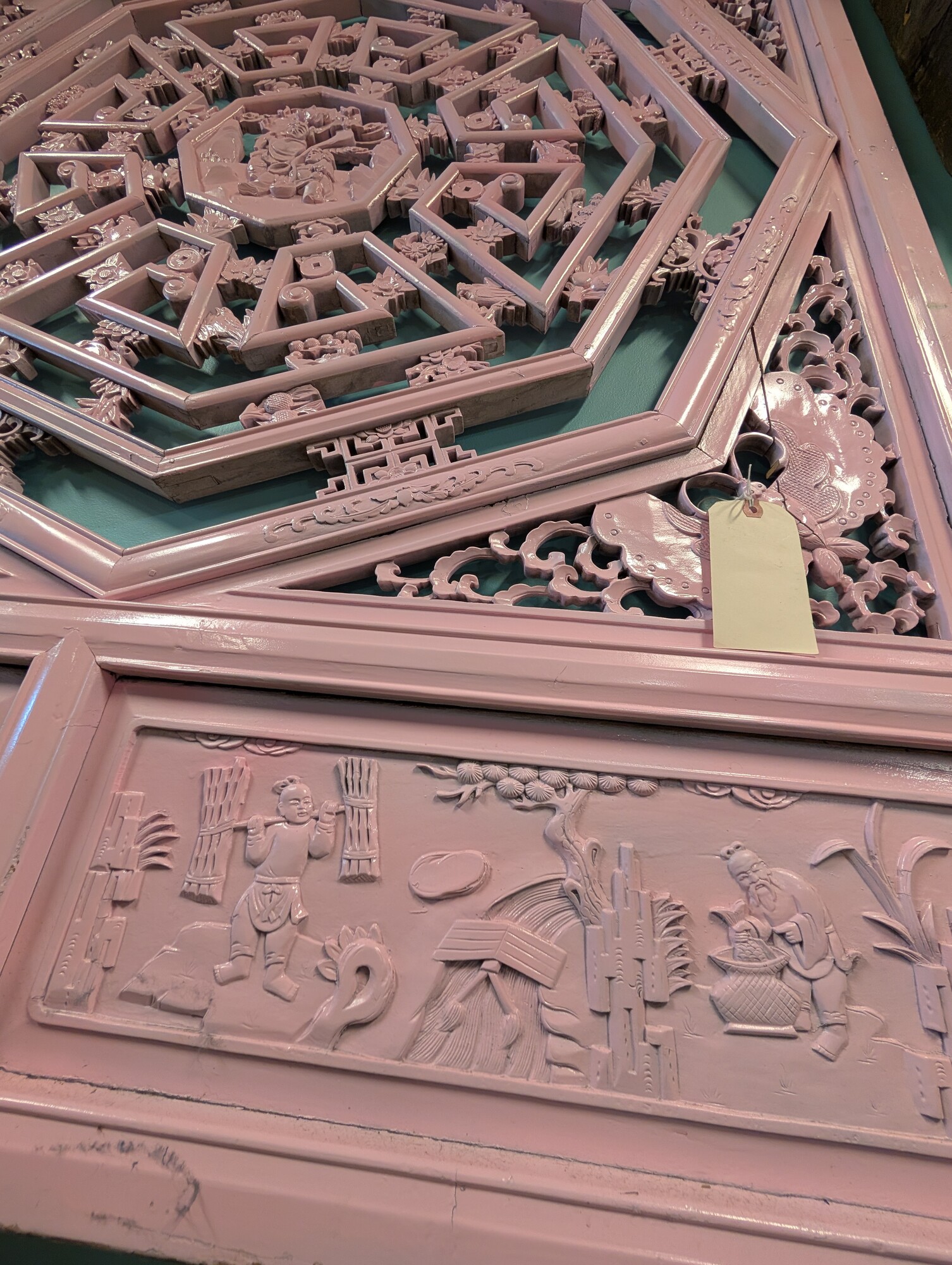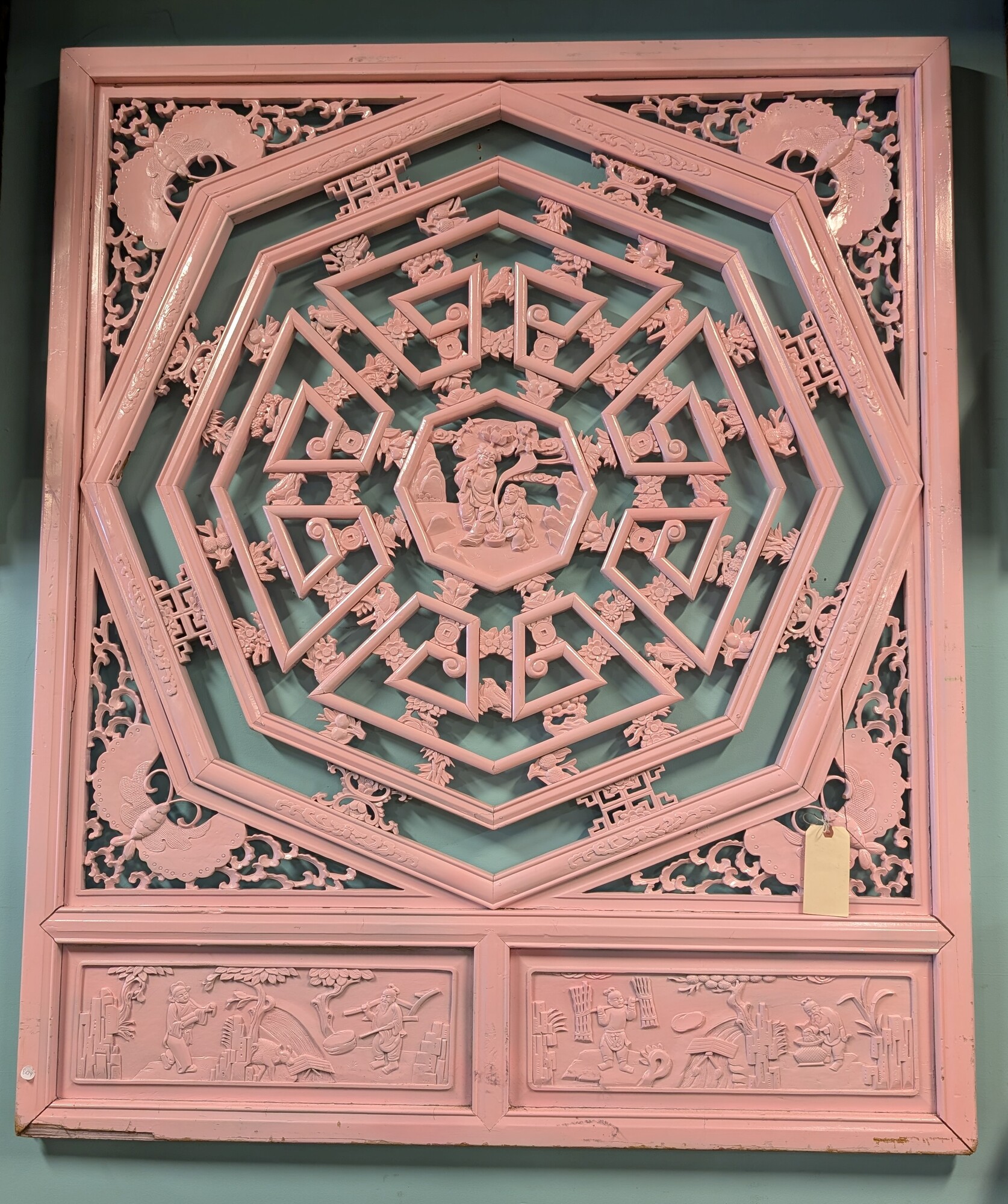 Chinese Carved Wood Screen, Pink, Vintage 51 x 61h