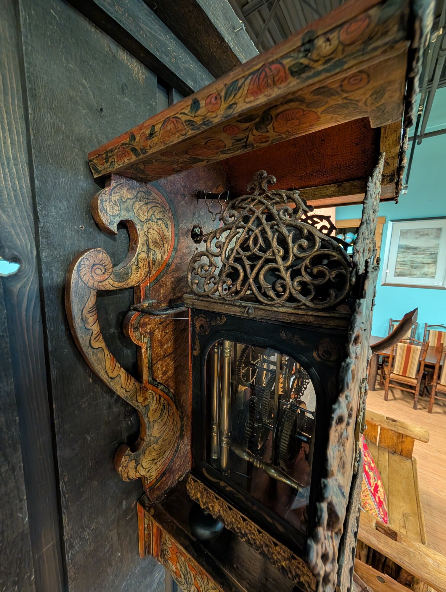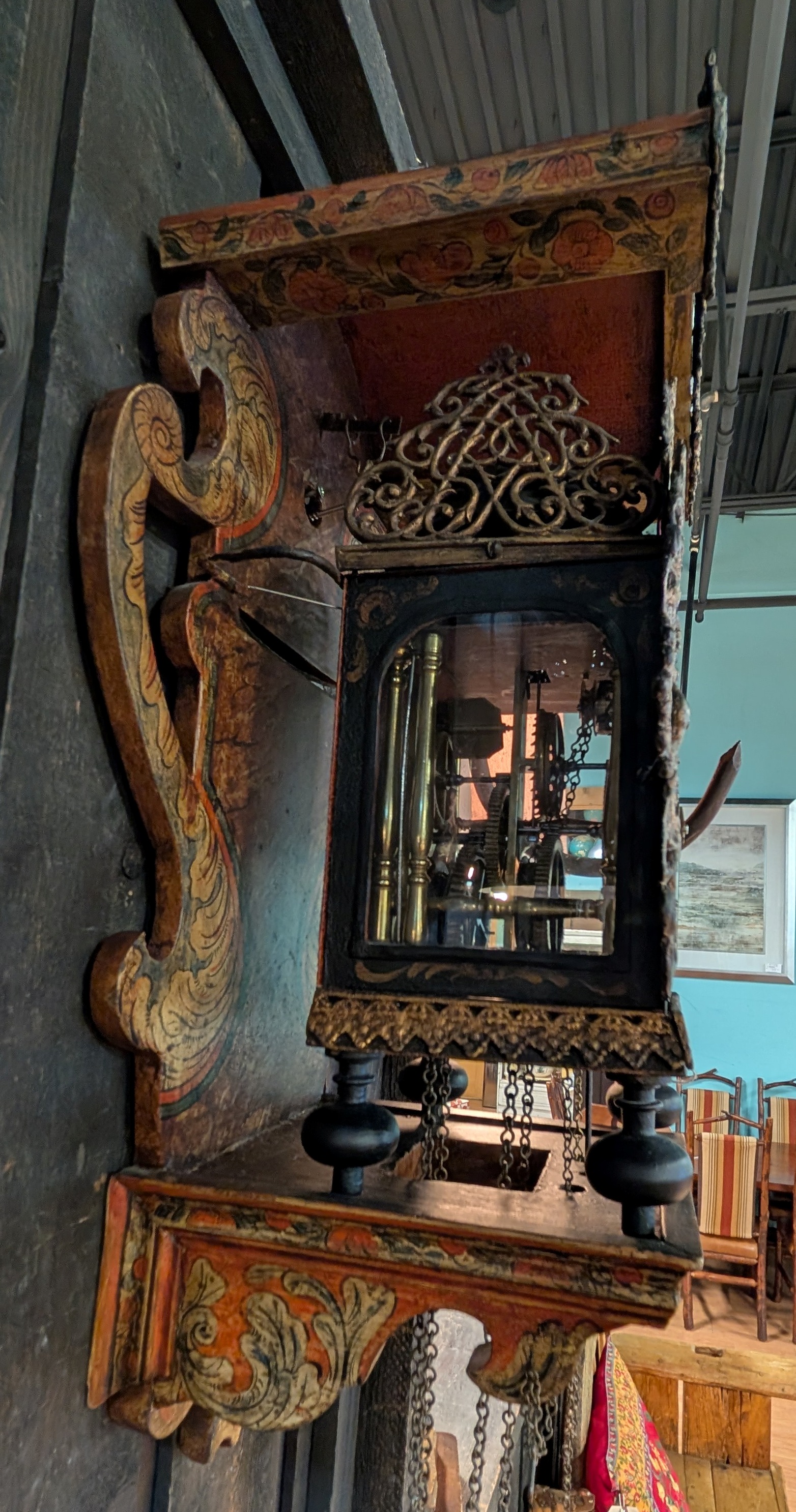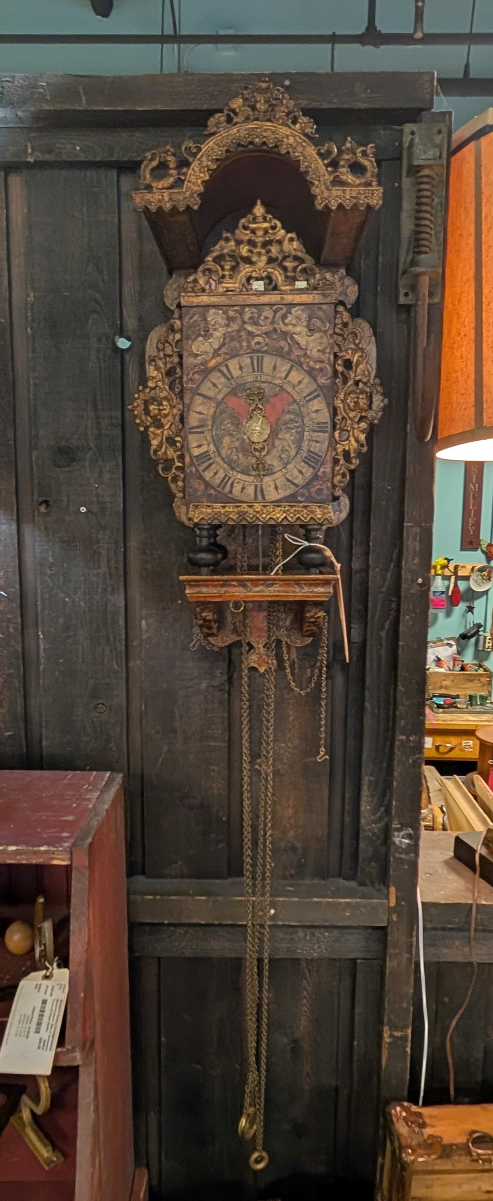Danish Frisian Stocklok, 18th C, Handpainted Glass, Metal Accents 12w x 10d x 28h Owner said it works, we have not tested.