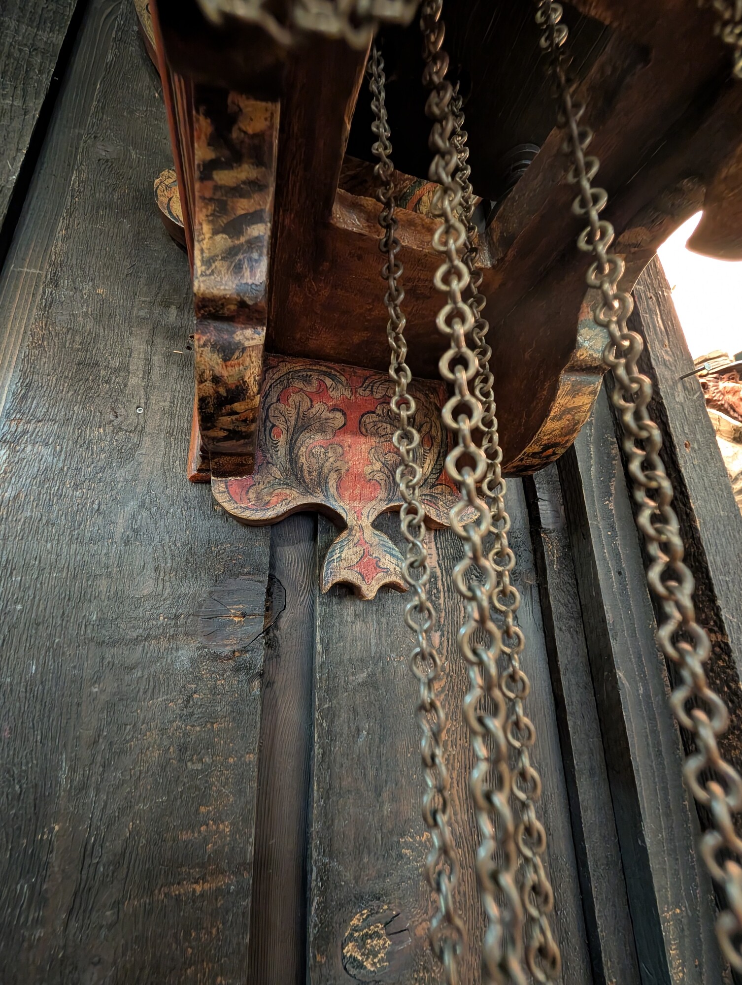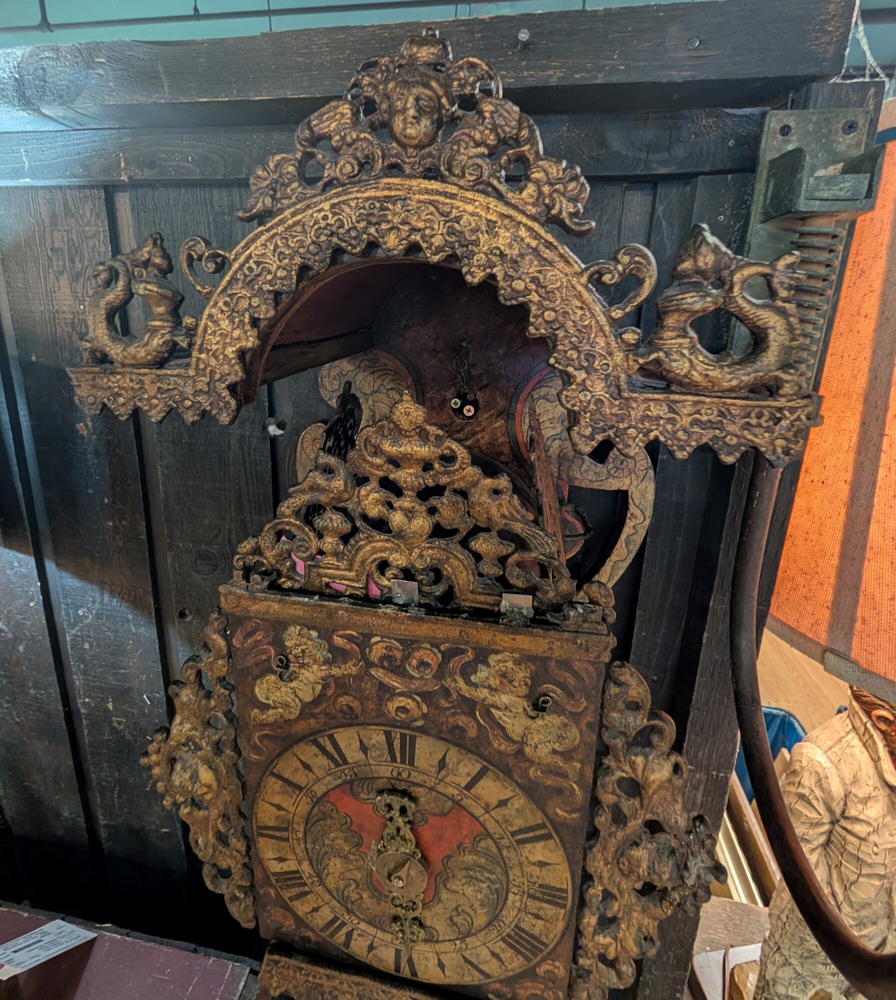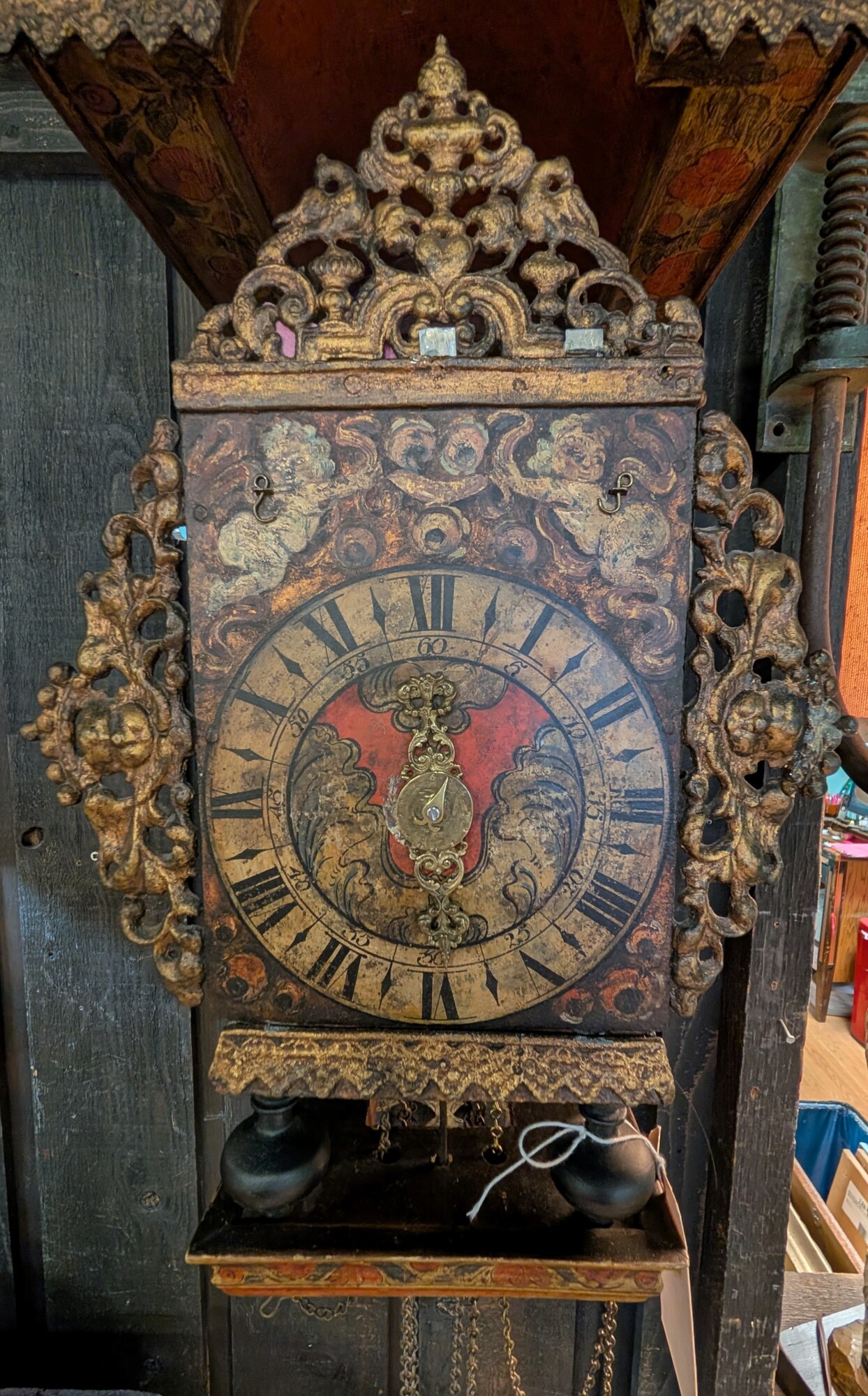 Danish Frisian Stocklok, 18th C, Handpainted Glass, Metal Accents 12w x 10d x 28h Owner said it works, we have not tested.