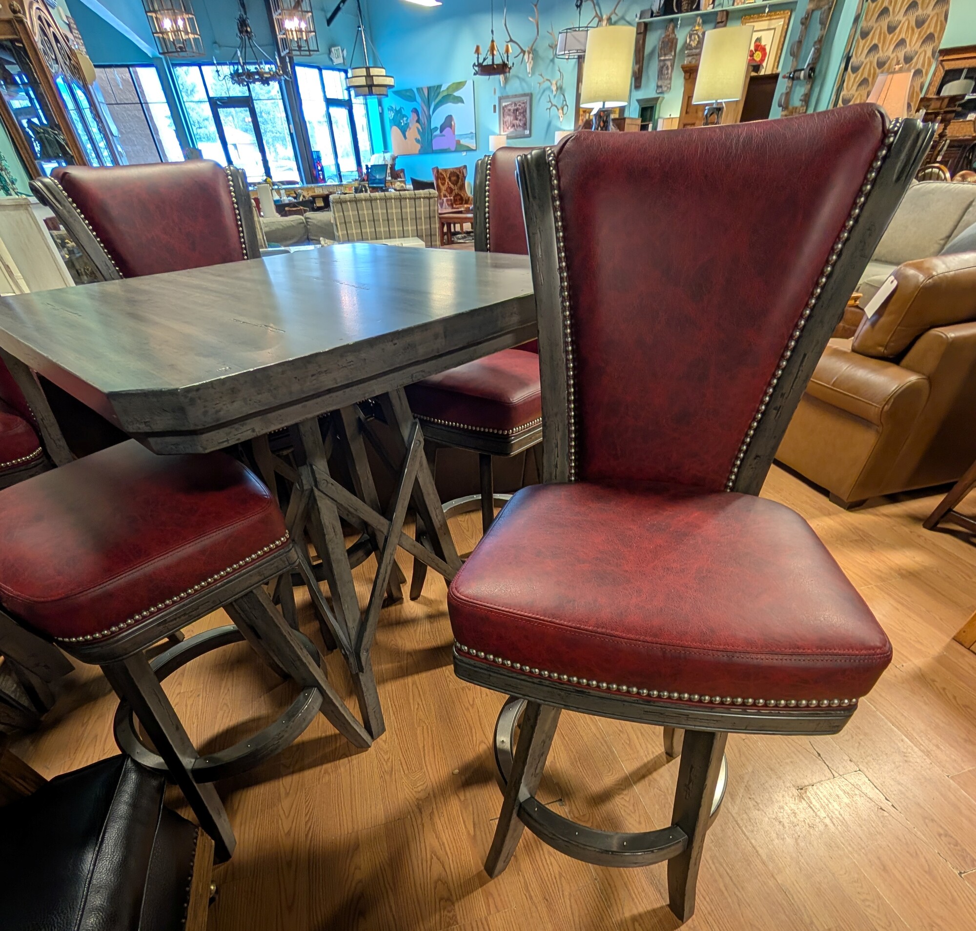 Darafeev Bistro Set, Gray, 4 Tilt Stools Red Leather 36 Square x 40.5h Chairs 30 seat height x 48h back