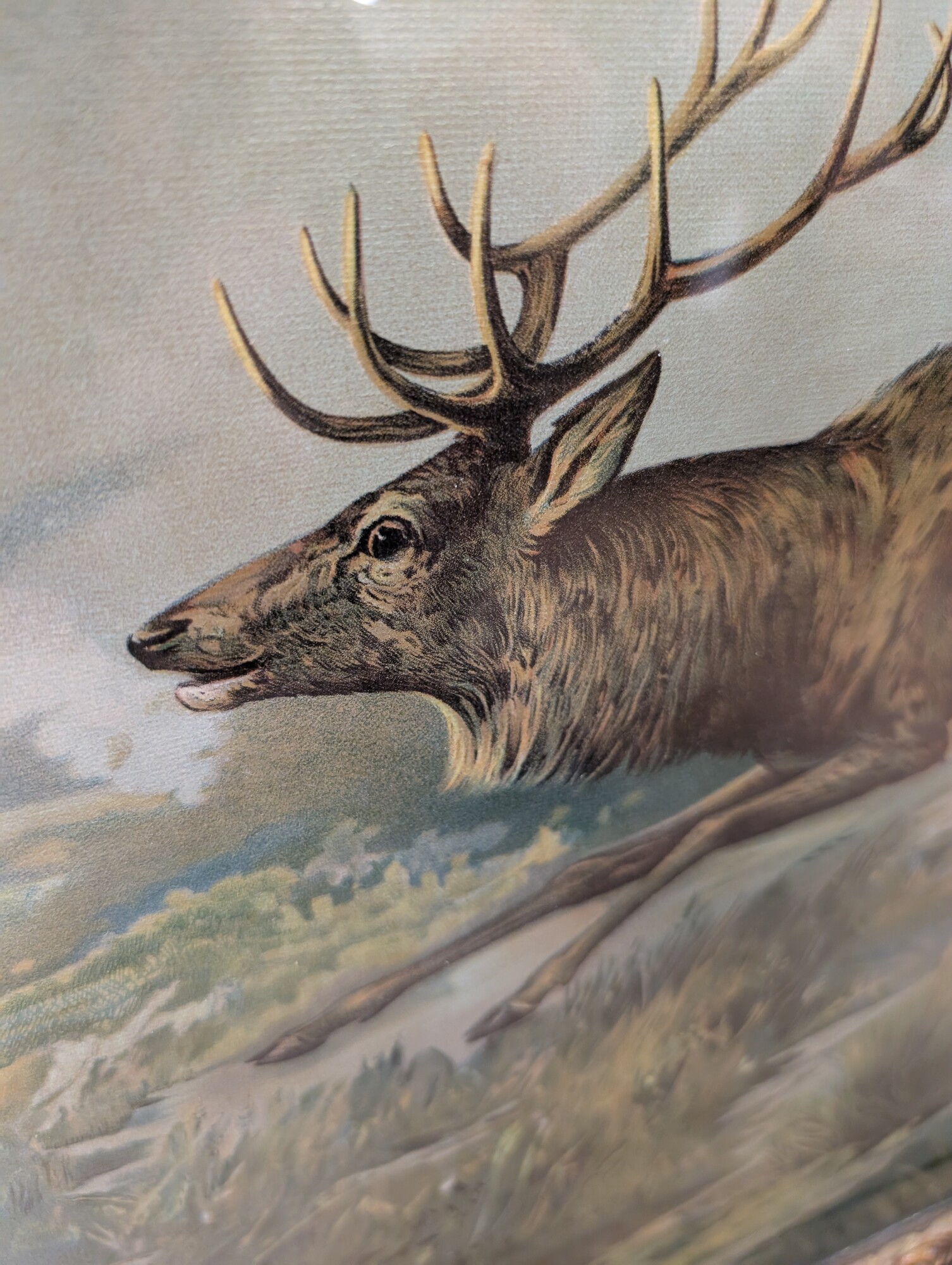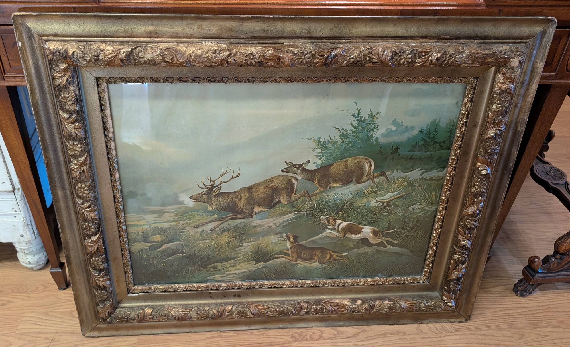 Elk Male/female Hunt Dogs, Antique Frame 38 x 30.5h