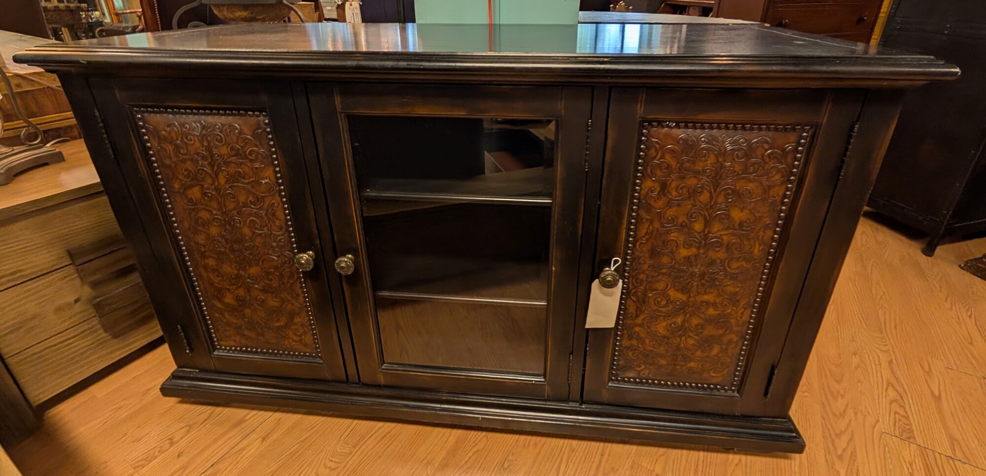 Entertainment Center, Black, Tooled Leather, 3 Door 60 x 23 x 36h