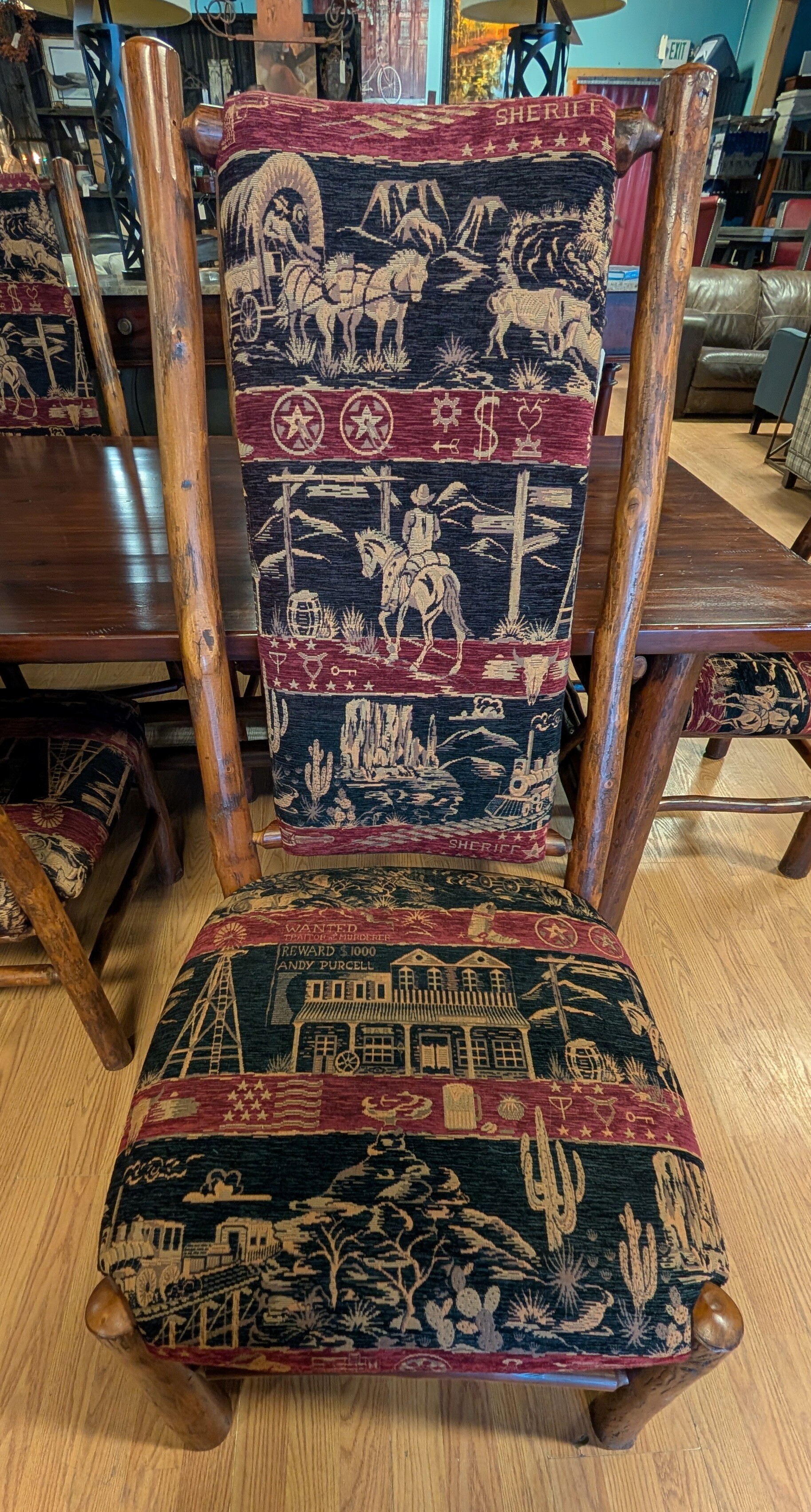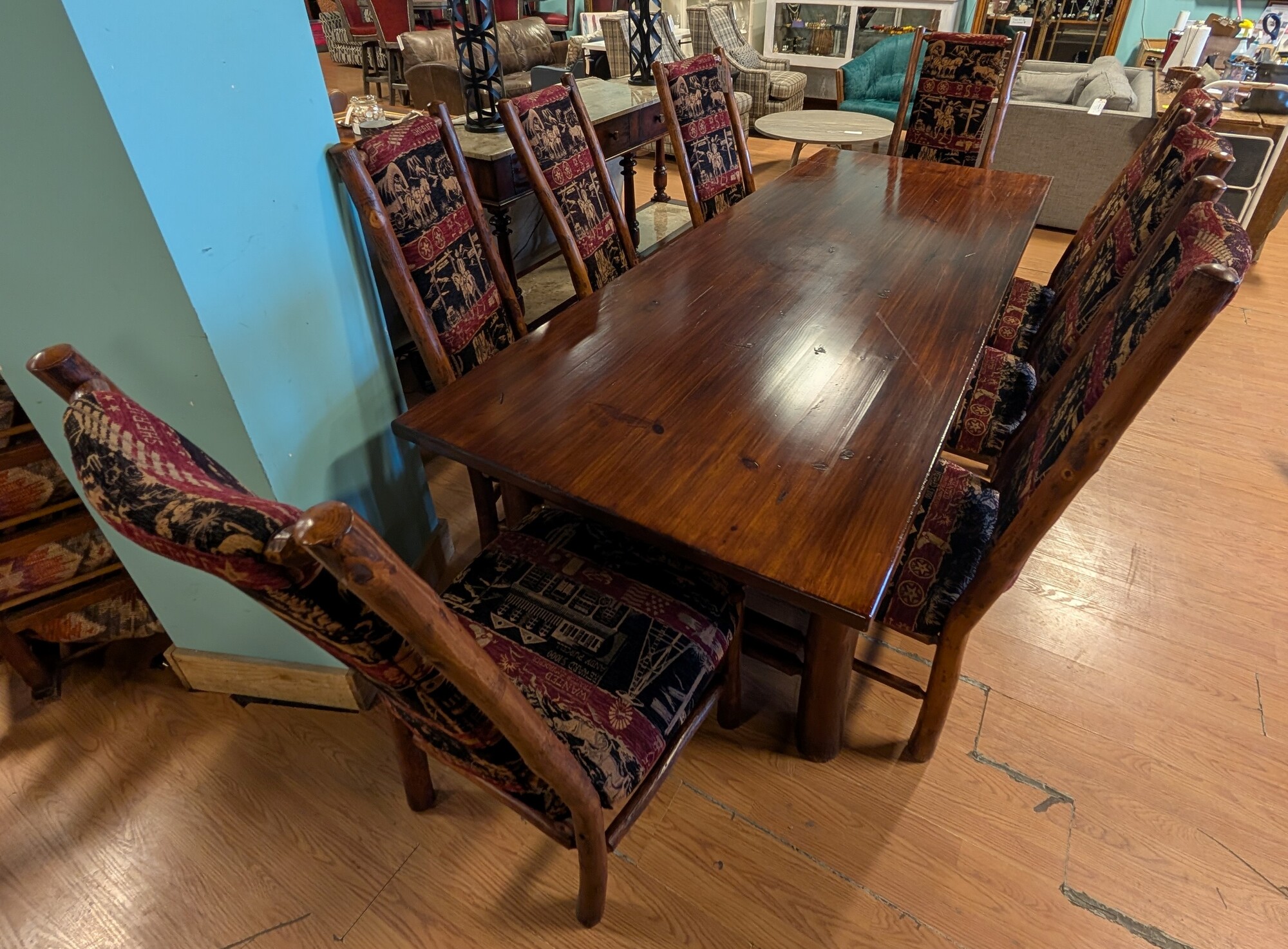 Hickory Dining Table, 8 Chairs 102w x 40d Chairs 23 x 22 x 48h 5ft x 11ft with Chairs pushed in