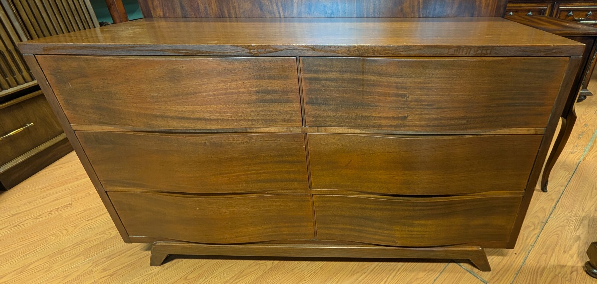 Mid Century Curved, Dark Stain, 6 Drawer 54 x 19 x 32h