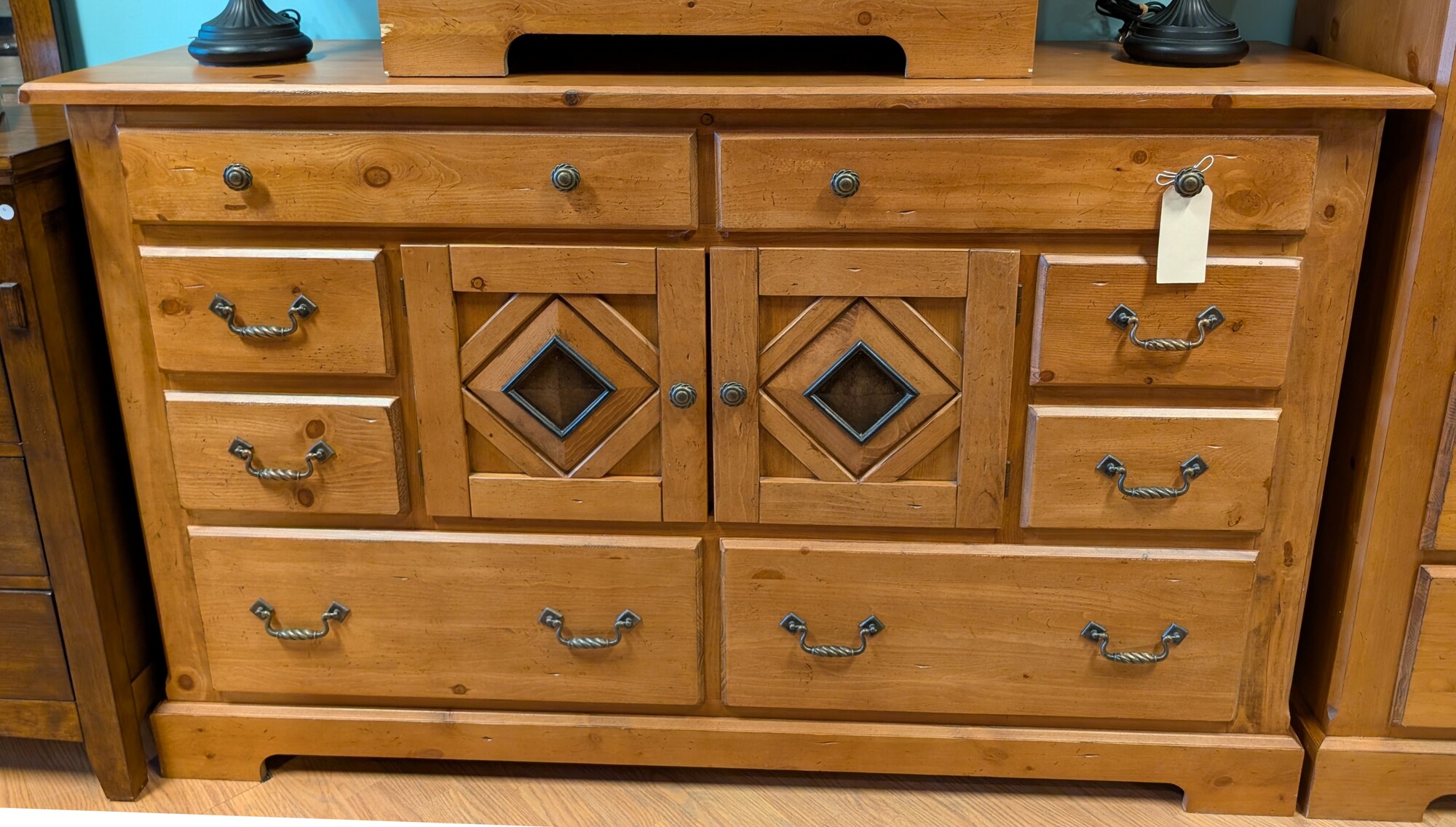 Rustic 8 Drawer 2 Door, Light Stain 66 x 18 x 41.5h